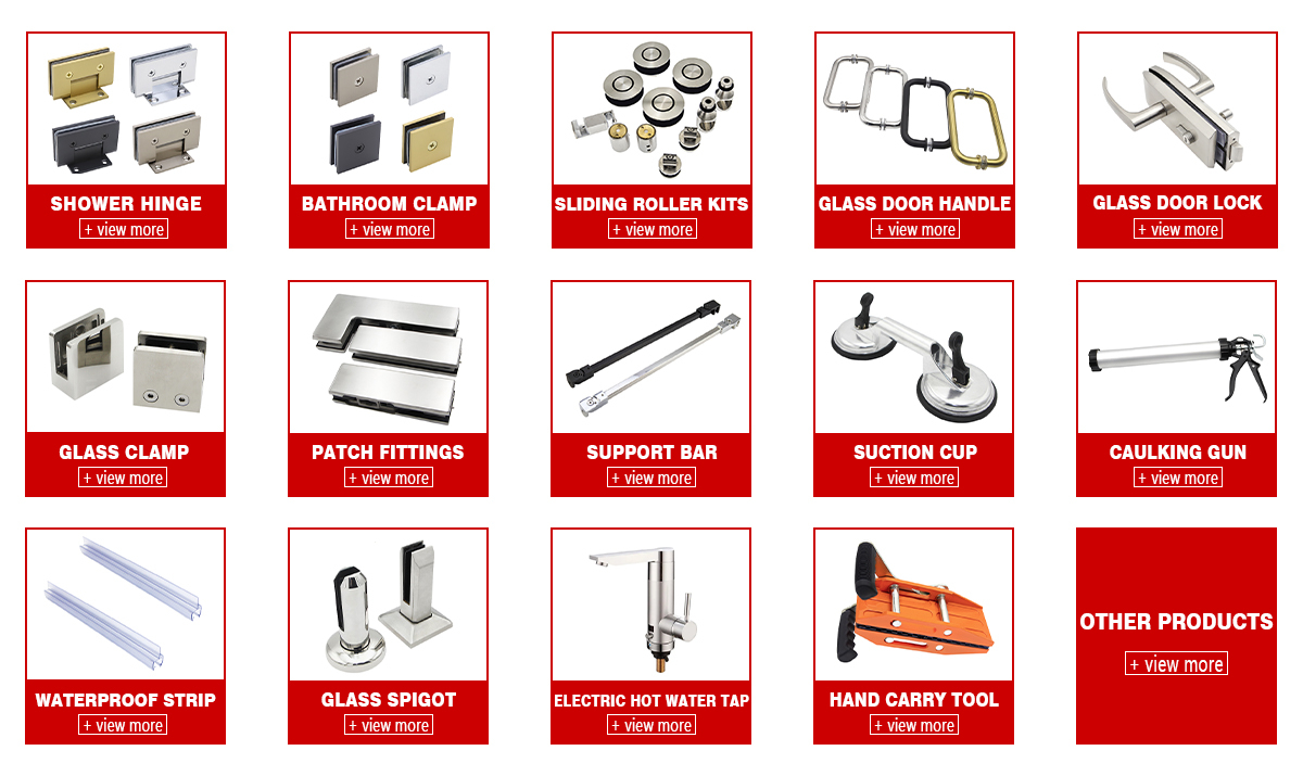 Productos principales:Abrazadera de vidrio, manija de puerta de ducha, bisagra de ducha, rodillo de puerta corredera, barra de soporte